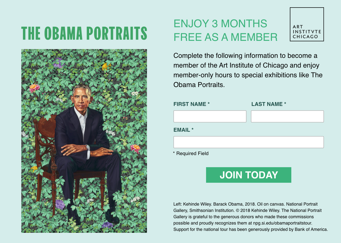 The Art Institute of Chicago requested a design that would feature the Obama Portraits with the offer of three months free and a CTA to sign up for a membership. The Art Institute of Chicago features historic and infamous artwork, including The Obama Portraits, so it was an honor to take part in bringing these works of art to a larger audience.