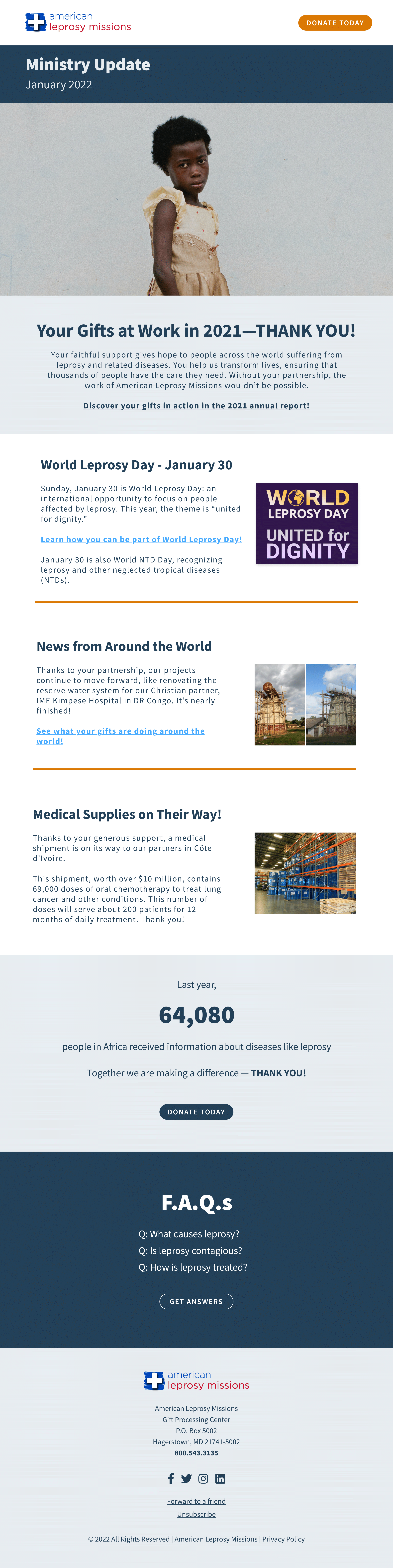 Over the years, I have had the pleasure of working with ALM for their very important cause as leprosy is neglected in the medical field. I designed and developed their current website (https://leprosy.org/) which consists of over one hundred pages. Every month I also worked on their monthly campaign which included email templates, lightboxes, and ads.