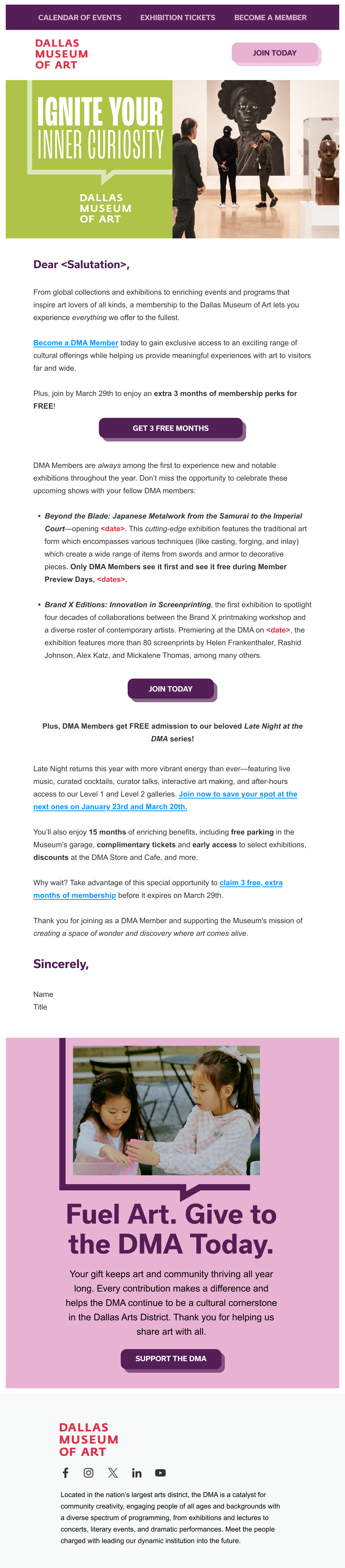 I’ve partnered with the museum for over five years to design and develop monthly email campaigns promoting the calendar of events, and encouraging art lovers to purchase exhibition tickets and become members to support the arts. I am also responsible for handling the museum’s membership forms and reporting to keep track of the ongoing and new members.